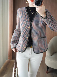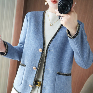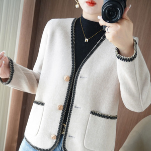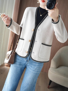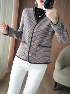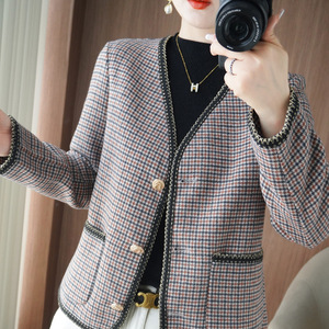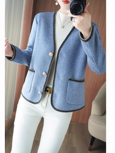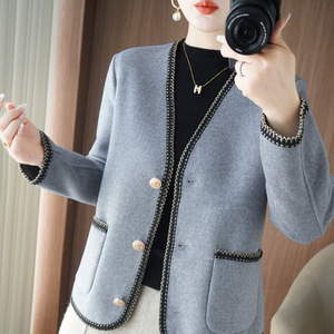 双面呢大衣女 秋冬新款V领开衫毛呢上衣 短款气质宽松 小香风外套