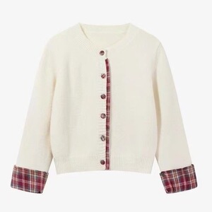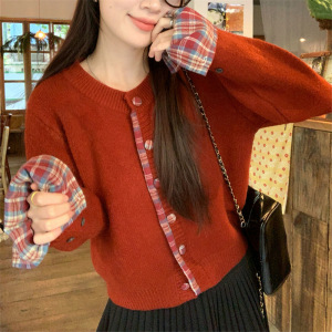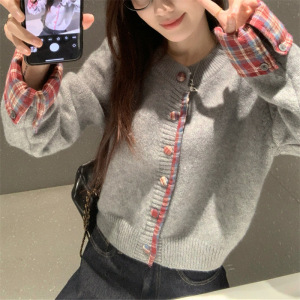 拼接格子假两件毛衣开衫女2025秋冬新款圆领韩系百搭针织上衣女潮