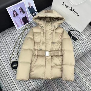 2025秋冬新款简约时尚百搭连帽拉链配腰带设计鹅绒羽绒服外套批发