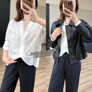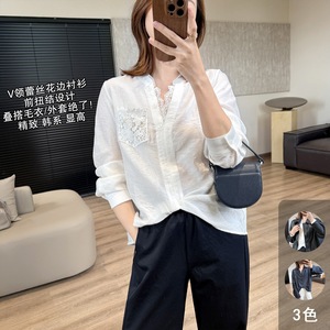 设计感扭结衬衫V领花边唯美上衣秋新款天丝亚麻长袖衬衫