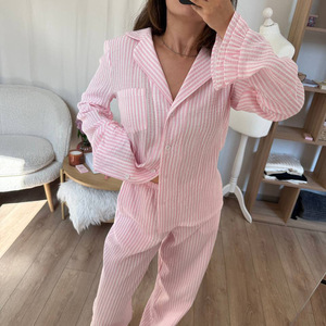 欧美2025秋季新品双层皱纱棉亲肤条纹长袖拼荷叶边长裤套装家居服