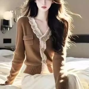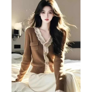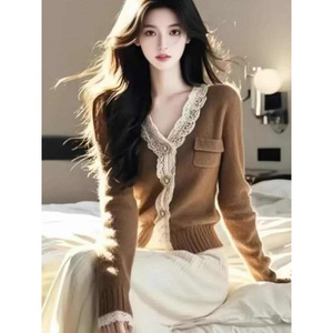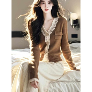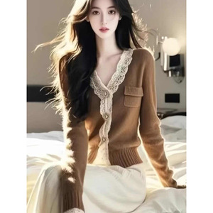 2025新款温柔气质棕色蕾丝边V领毛衣针织开衫高级感上衣秋季女装