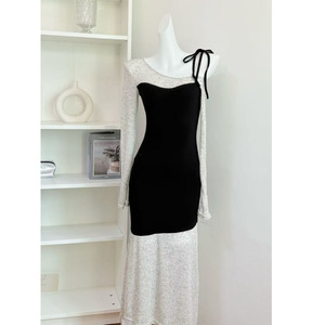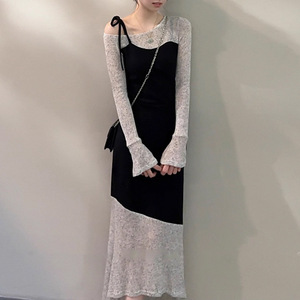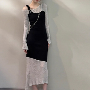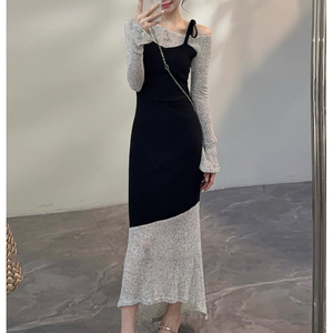 2025秋季新款拼色不规则假两件喇叭袖针织中长连衣裙其实修身长裙