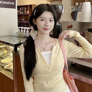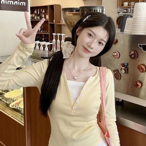 2025年新款拼接假两件长袖T恤女秋季新款修身显瘦甜辣妹短款上