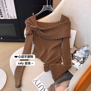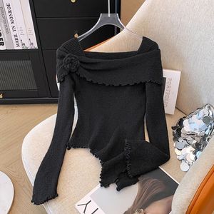 纯欲风立体花朵不规则喇叭袖针织衫女2024秋收腰显瘦露肩外穿上衣