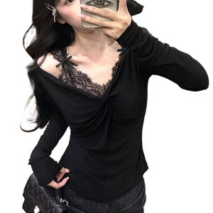 十三行小香风扭结V领纯欲风蕾丝花边T恤女高级感紧身显瘦上衣