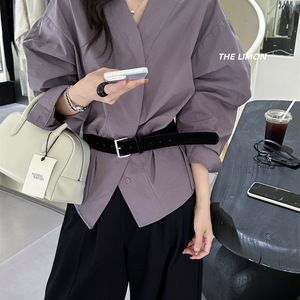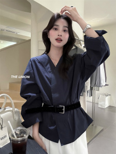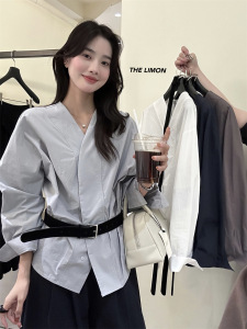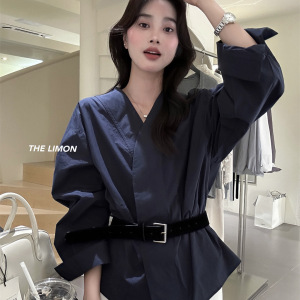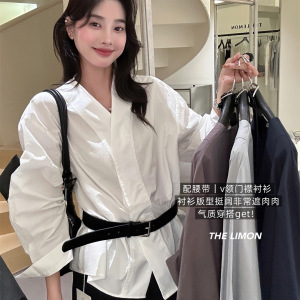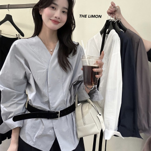 the limon柠檬绿茶2025秋季新款法式纯色简约V领长袖衬衫女上衣