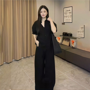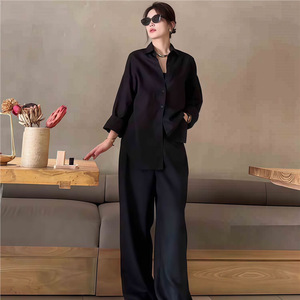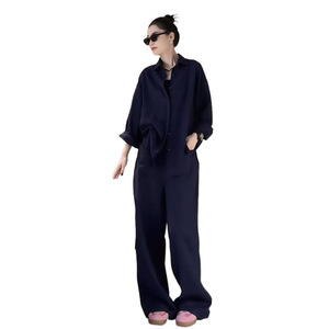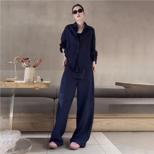 极简风时尚通勤套装女气质高级感藏蓝色宽松衬衫休闲阔腿裤两件套