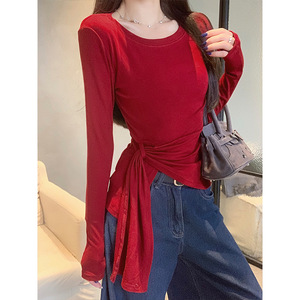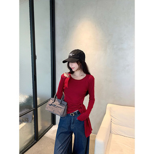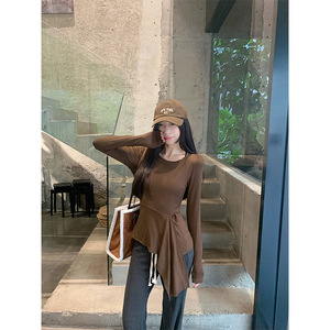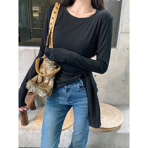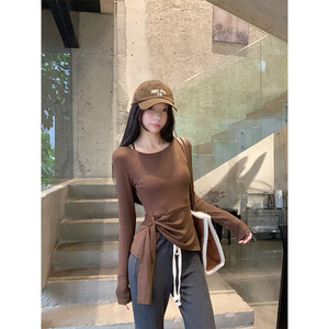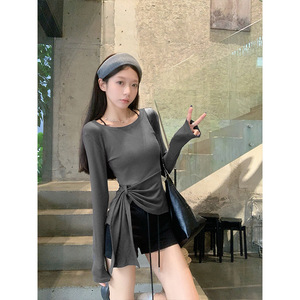 2025早秋新款韩系下摆不规则开叉收腰设计感显瘦百搭斜肩长袖T恤
