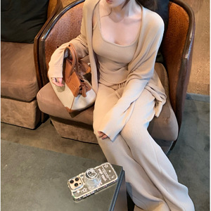 韩系「贵感松弛」亚麻针织开衫外套吊带直筒裤套装女2025秋季新款