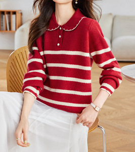 甜美小个子针织上衣娃娃领毛衣女新款秋冬洋气减龄时髦条纹外套