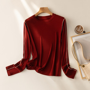 羊毛天丝慵懒长袖撞色线打底衫圆领长袖t正肩上衣细节控设计款
