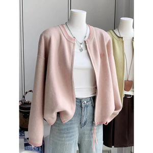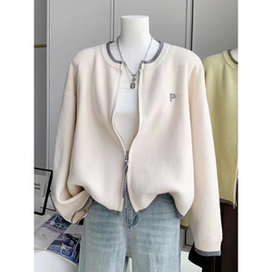 韩版宽松双拉链外穿针织开衫女2025秋冬新款拼色刺绣毛衣休闲外套