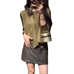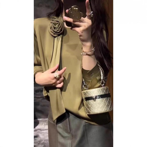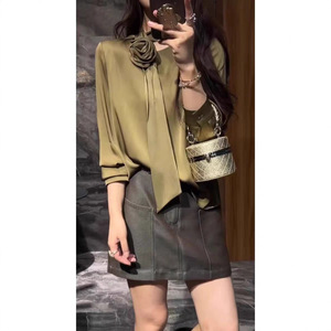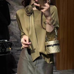秋季法式独特精致小上衣气质高级感别致绝美立体花朵绿色飘带衬衫