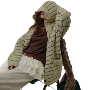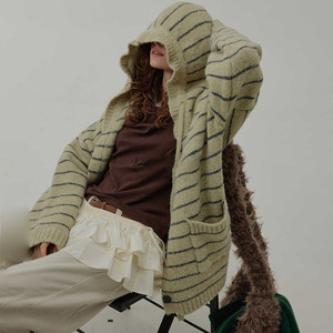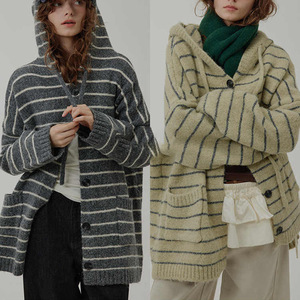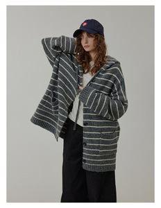 撞色条纹连帽抽绳针织开衫复古文艺中长款毛衣