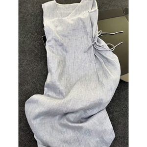 2025气质名媛高端女神范长裙蓝色v领无袖亚麻棉麻背心连衣裙夏季