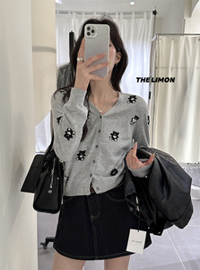 the limon柠檬绿茶2025秋季卡通减龄小熊v领针织开衫女短款上衣