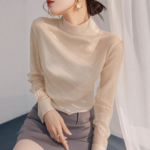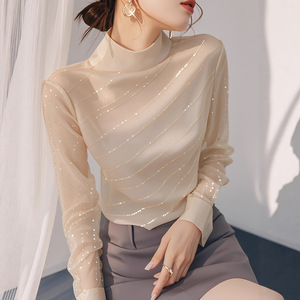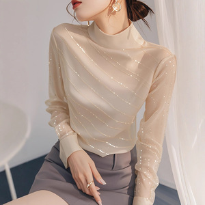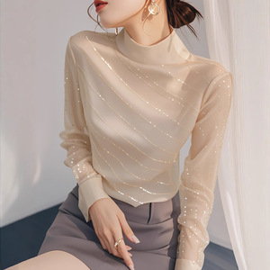 早秋新款今年流行的漂亮小衫法式气质上衣浅米色亮片长袖女款夏季