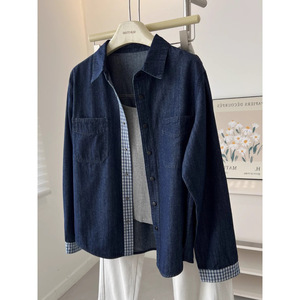 深蓝色复古正肩牛仔衬衫女春秋高级感宽松叠穿衬衣休闲开衫外套潮