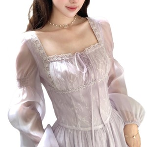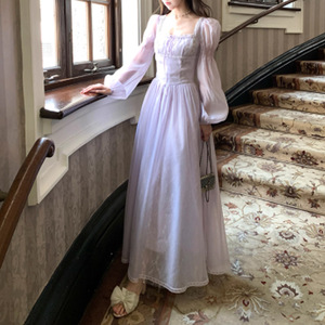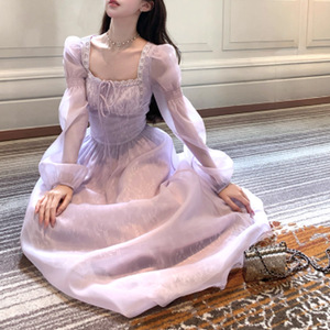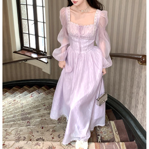 紫色长款方领长袖连衣裙女夏季法式复古千金风气质收腰裙子套头潮