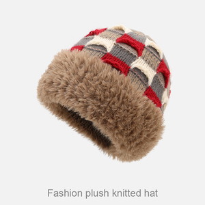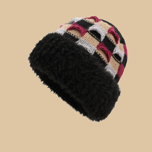 新款女秋冬毛线帽子彩色拼接加厚针织帽毛绒保暖时尚百搭冷帽批发
