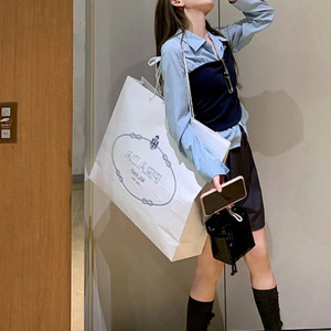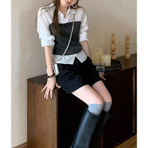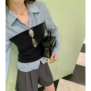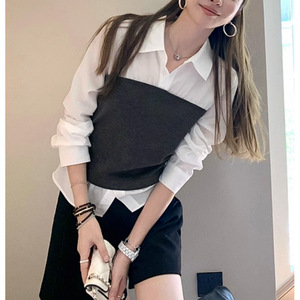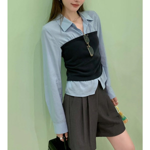 高智office lady·秋季新款蓝色假两件收腰长袖衬衫女上衣2025新