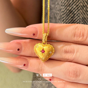 轻奢老钱风中古沙金拉丝双面微镶锆石钻复古爱心星芒吊坠锁骨项链