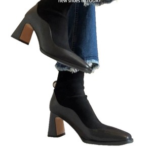 法式复古拼接棕色弹力瘦瘦靴女方头后拉链高跟短靴小个子袜子靴