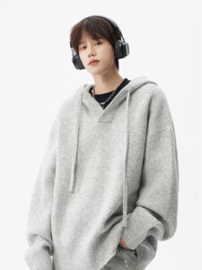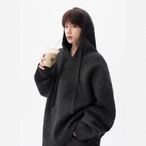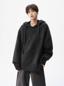 美式连帽针织衫外套男秋季潮牌花灰色情侣毛衣高街慵懒风百搭上衣