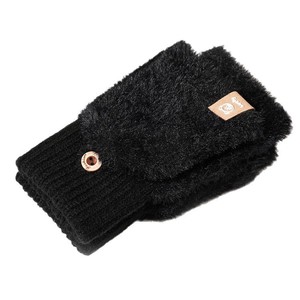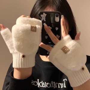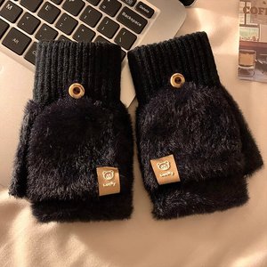可爱小熊露半指翻盖毛绒针织手套女冬季保暖加厚防寒写字触屏骑行