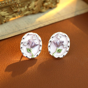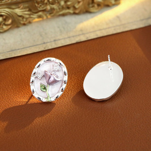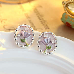 油画风紫色立体郁金香耳钉法式微镶复古滴油花朵耳环小众优雅耳饰