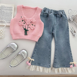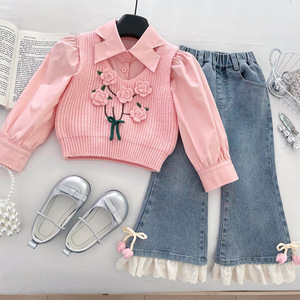 2025秋季新款女童三件套洋气立体花朵针织马甲衬衫花边牛仔裤套装