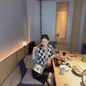 赵辰晨 撞色菱格针织开衫女秋季2025新款学院风减龄洋气长袖外套