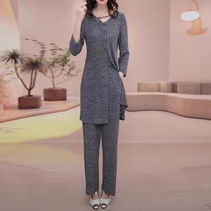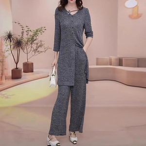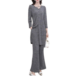 秋冬季洋气女装质遮肚时尚休闲套装女显瘦中长款上衣阔腿裤两件套