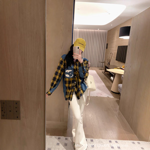 【不支持退货】显白洋气黄格子牛仔拼接复古格子长袖衬衫女款