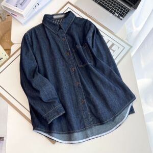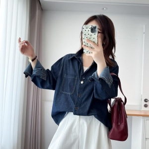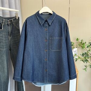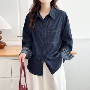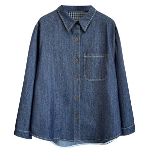 200斤胖妹妹早秋新款休闲格子拼接长袖牛仔衬衫大码休闲上衣8050