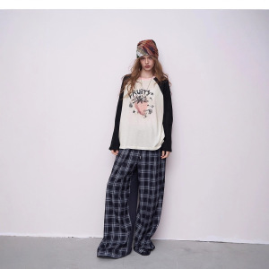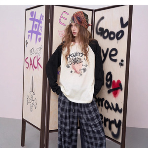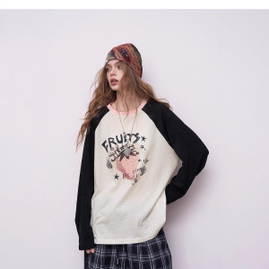 妖精的 撞色插肩草莓印花长袖t恤女2025秋新款松弛感休闲上衣