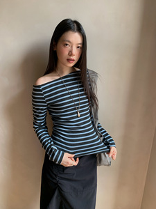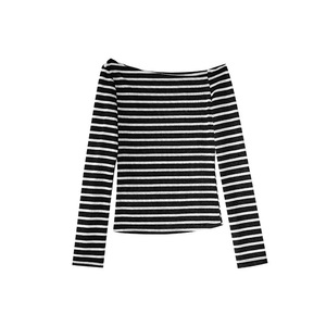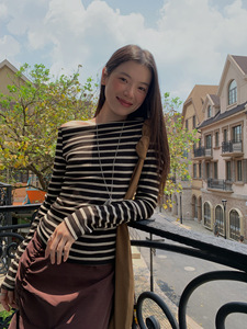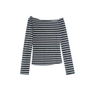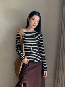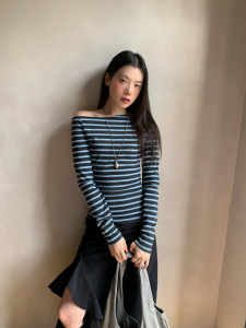 诠释美 NEWOPEN 25秋时尚复古涤棉长袖斜肩领条纹t恤上衣女F6503