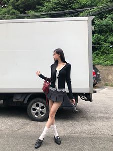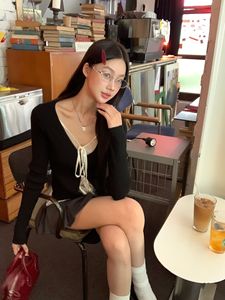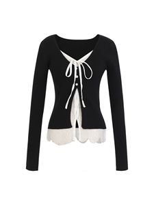 黑色辣妹风蕾丝拼接绑带假两件撞色打底衫女春季新款显瘦长袖上衣