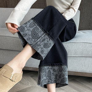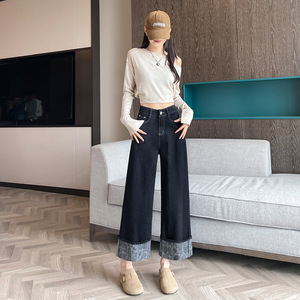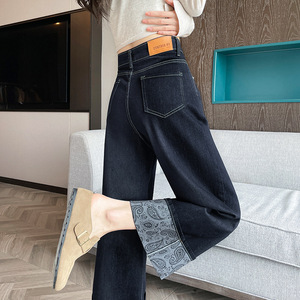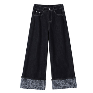黑金蓝阔腿牛仔裤女2025新款小个子翻边印花高腰显瘦宽松直筒裤子
