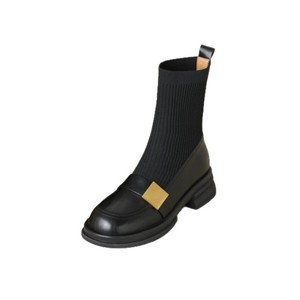 2025年复古棕色软皮圆头厚底针织袜靴女百搭金属扣松糕弹力时装靴