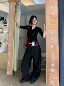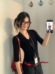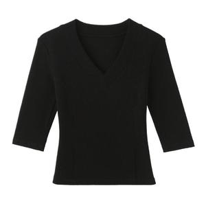 2025早秋黑色V领五分中袖短袖t恤女早秋新款修身设计感短款小上衣
