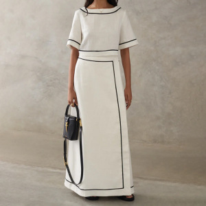 欧美气质女装黑白撞色裙套装新款圆领短款系带上衣半身长裙两件套
