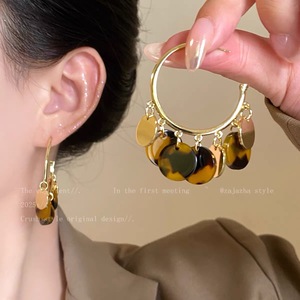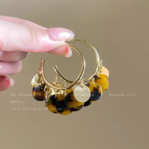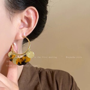 夸张C型豹纹圆片流苏耳钉女款轻奢高级感法式耳环小众设计耳饰