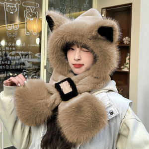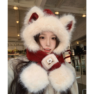 韩版毛绒可爱狐狸耳帽子围巾一体女秋冬季脖骑车保暖两件套连帽围