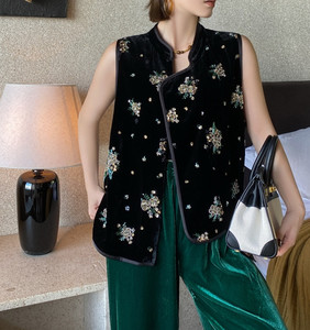 篙品质真丝丝绒钉珠国风马甲2025秋款时尚百搭黑色马夹上衣不退换