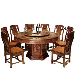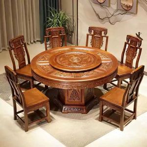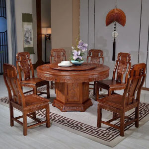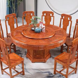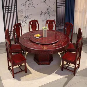 金花梨木全实木餐桌椅组合明清古典大圆桌中式仿古雕花带转盘饭桌