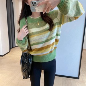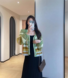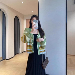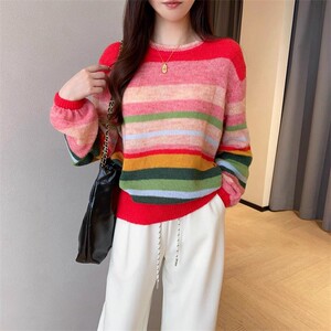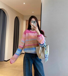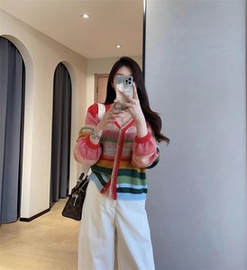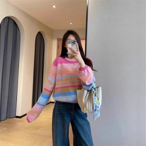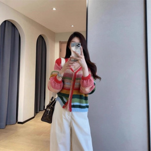 EU93氛围感缤纷渐变羊毛细软亲肤条纹圆领毛衣V领开衫女2025秋