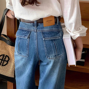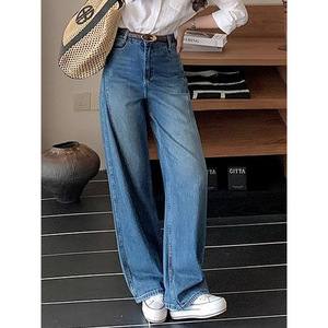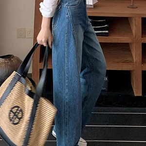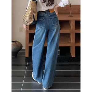 2025年新款胖mm蓝-丹宁蓝-蓝色阔腿牛仔裤女秋款大码高腰直筒裤子