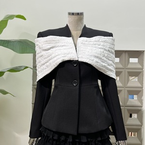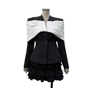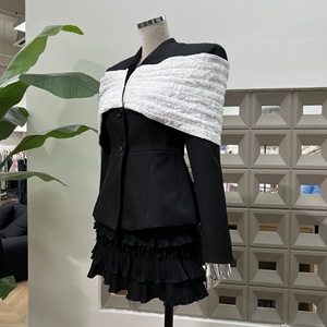 亚马逊名媛一字肩西装外套+压褶蛋糕黑色半裙显瘦轻熟风2025秋季